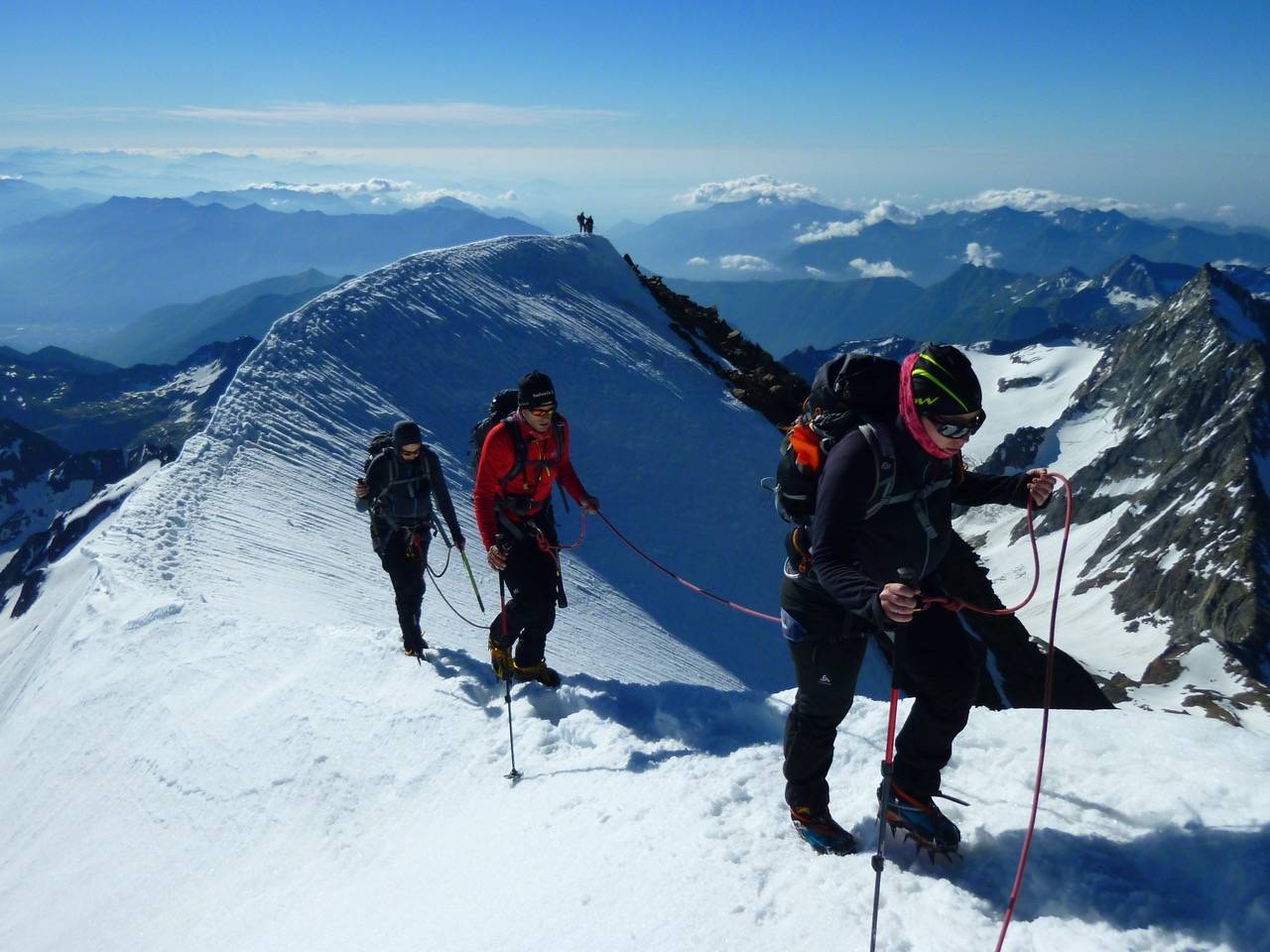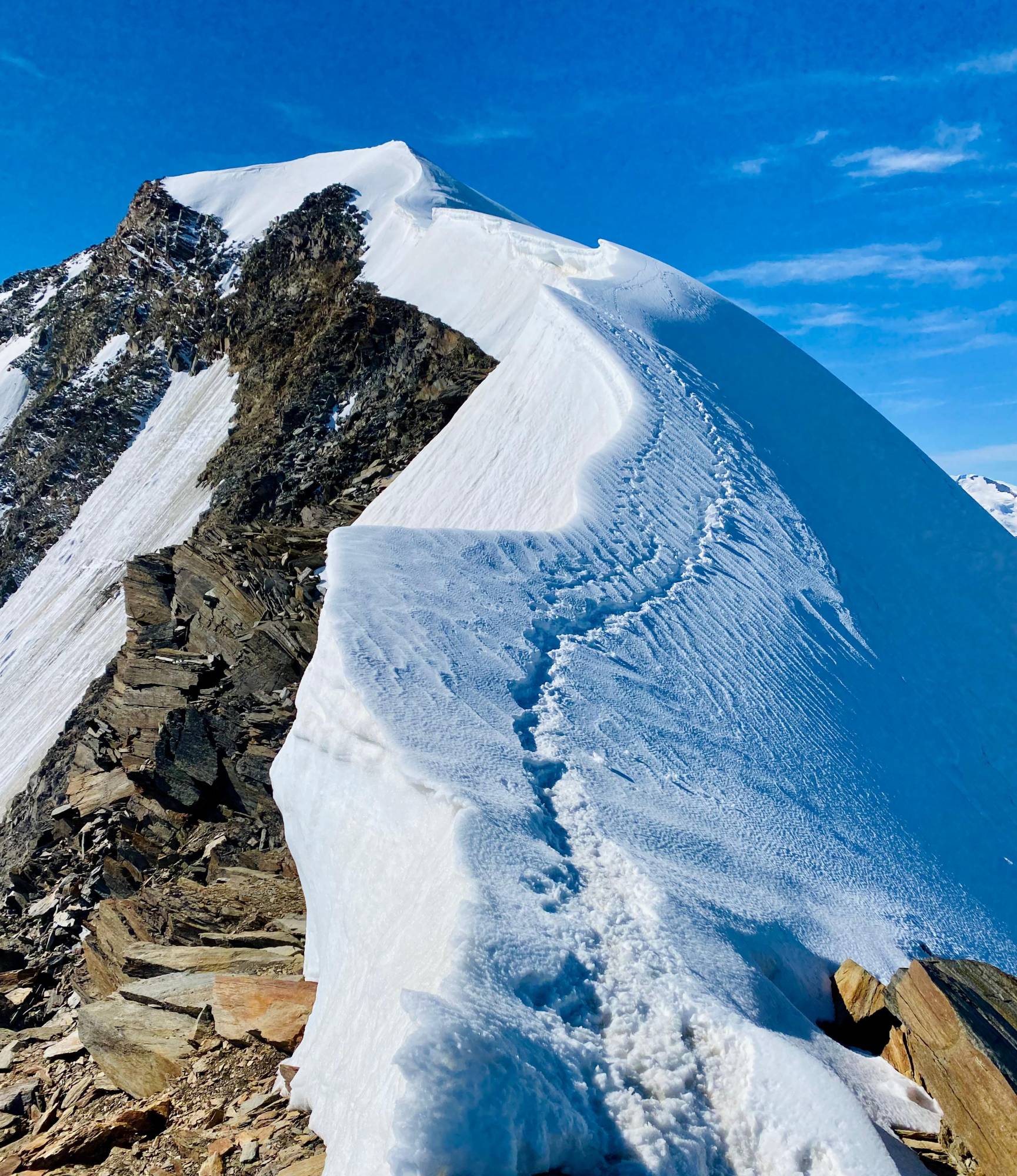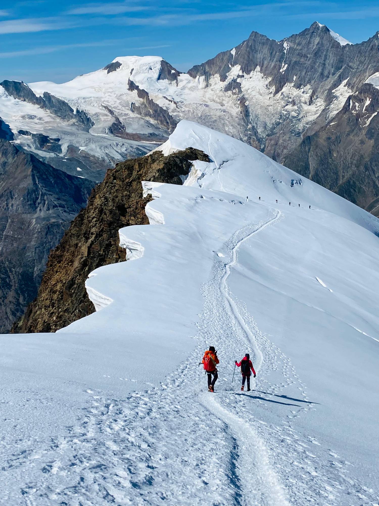 This traverse in combination with the descent down the ice armoured Northwest face to Hohsaas is among the easiest and most beautiful mixed snow and rock climbs of the classic 4000 meter peaks. It is also considered by many to be one of the best traverses of its difficulty in the Alps.