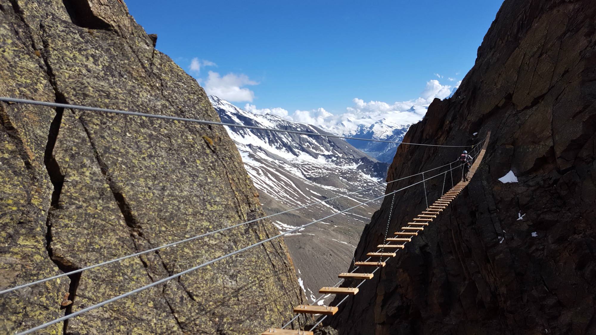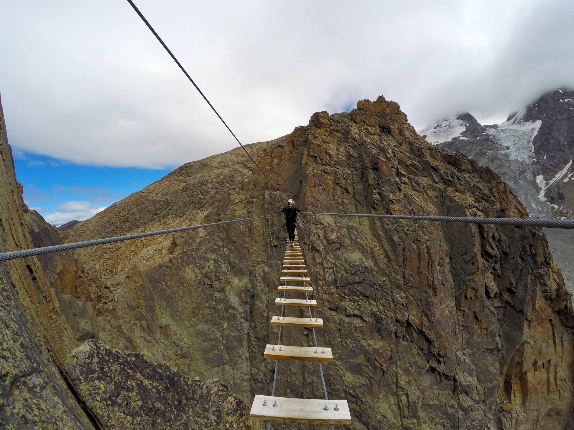 This Alpine via ferrata is considered to be one of the most beautiful in all of Switzerland. The starting point is the mid-station of the gondola at Kreuzboden. This demanding tour offers an excellent mix of climbing and scrambling. You will encounter steep ladders and airy aretes. During the climb you will be surrounded by breathtaking scenery in rock, snow and ice. The stunning views of the Mischabel Group and the distant peaks of the Monte Rosa will accompany you all the way to the summit